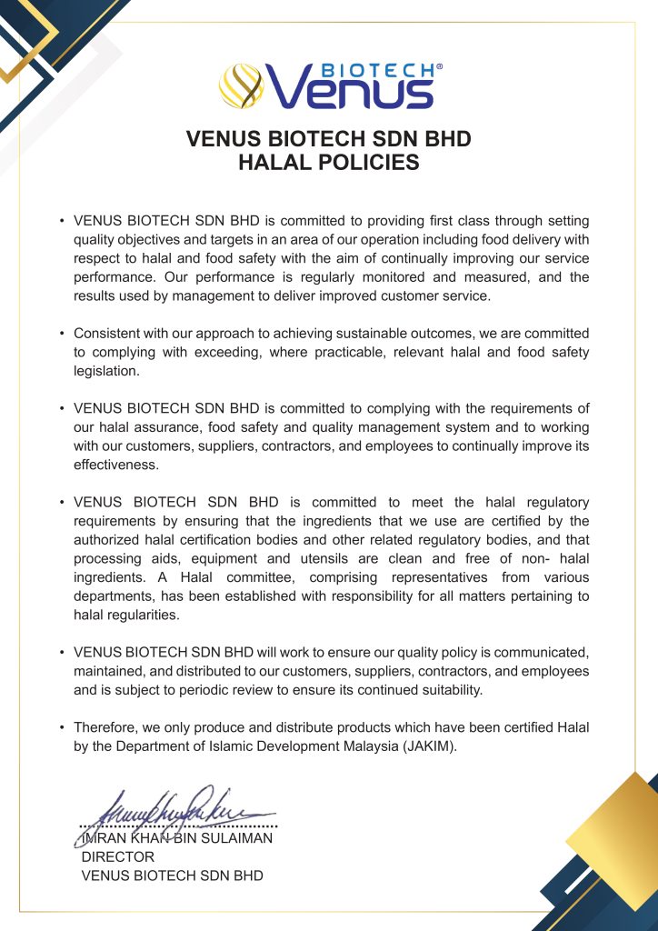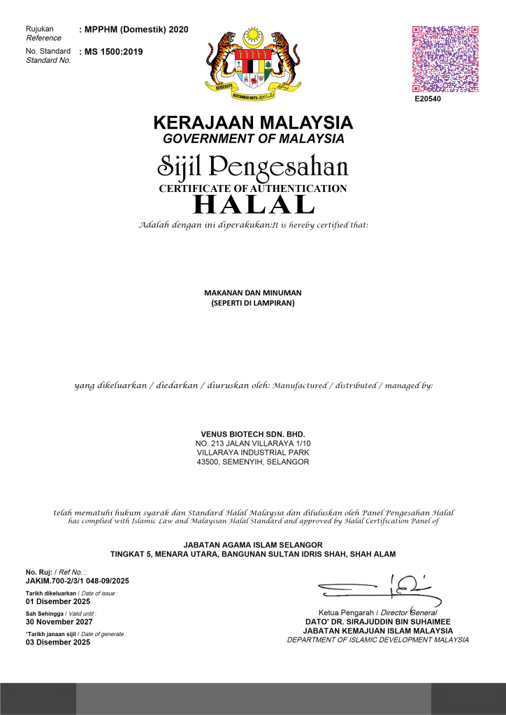 Venus Biotech Sdn. Bhd. is a Muslim-owned company committed to producing high-quality food products that fully comply with Halal principles and established standards. All our food products are certified Halal by Jabatan Agama Islam Selangor (JAIS) in accordance with Malaysian regulations and guidelines.